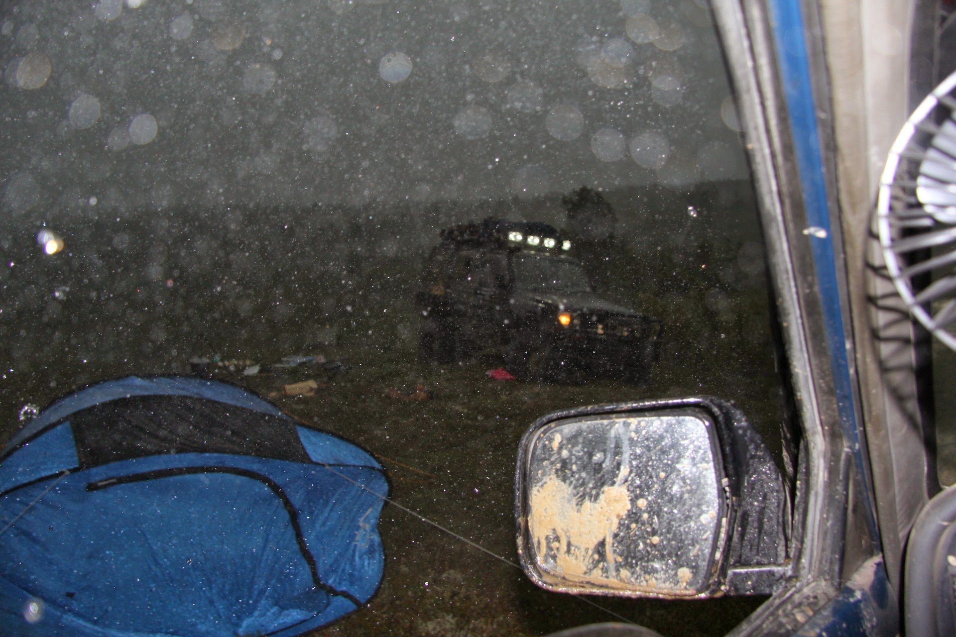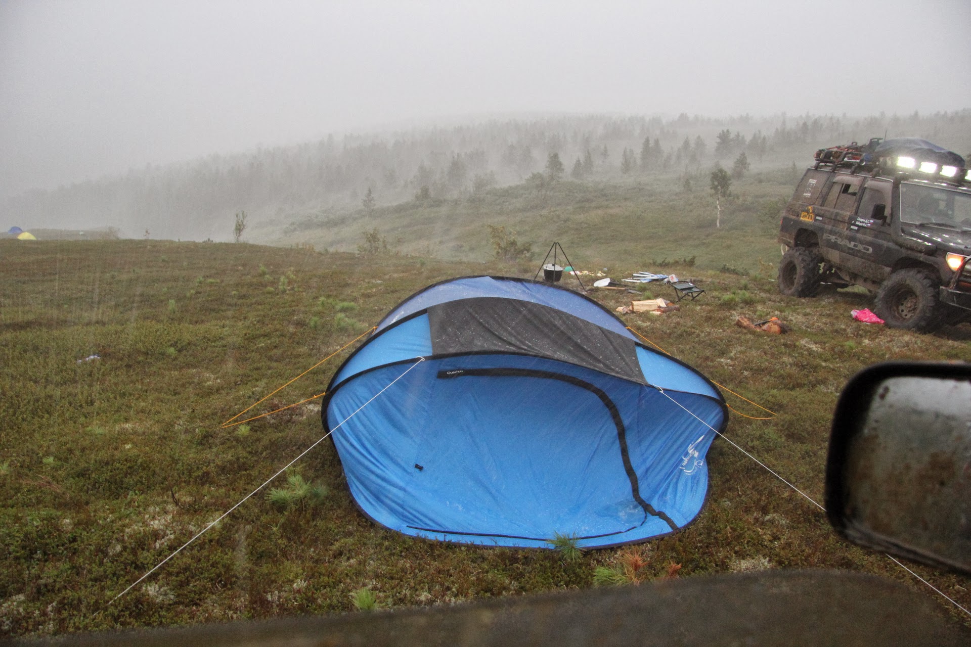 Когда гроза стихла, обнаружилось, что ветром унесло некоторые вещи (в основном вещи тех, кто принимал душ, а также дождевик и стол с едой и посудой), порвало одну палатку.
