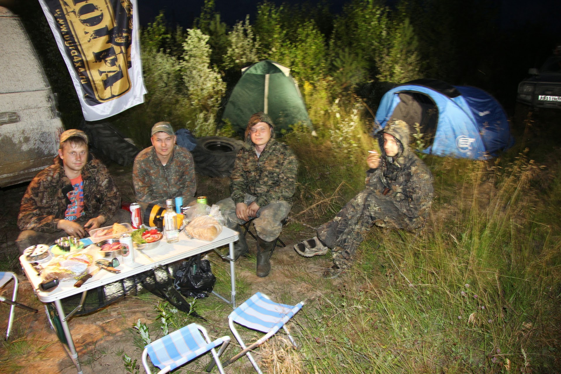 Около 7 часов вечера доехали до того места, где планировалось остановиться на первую ночевку. Получилось на вторую. Съездили в лес за дровами, протестировали походный ноутбук на устойчивость к воде. Ужинали шашлыками. Спать легли вполне довольные в начале 1-го.